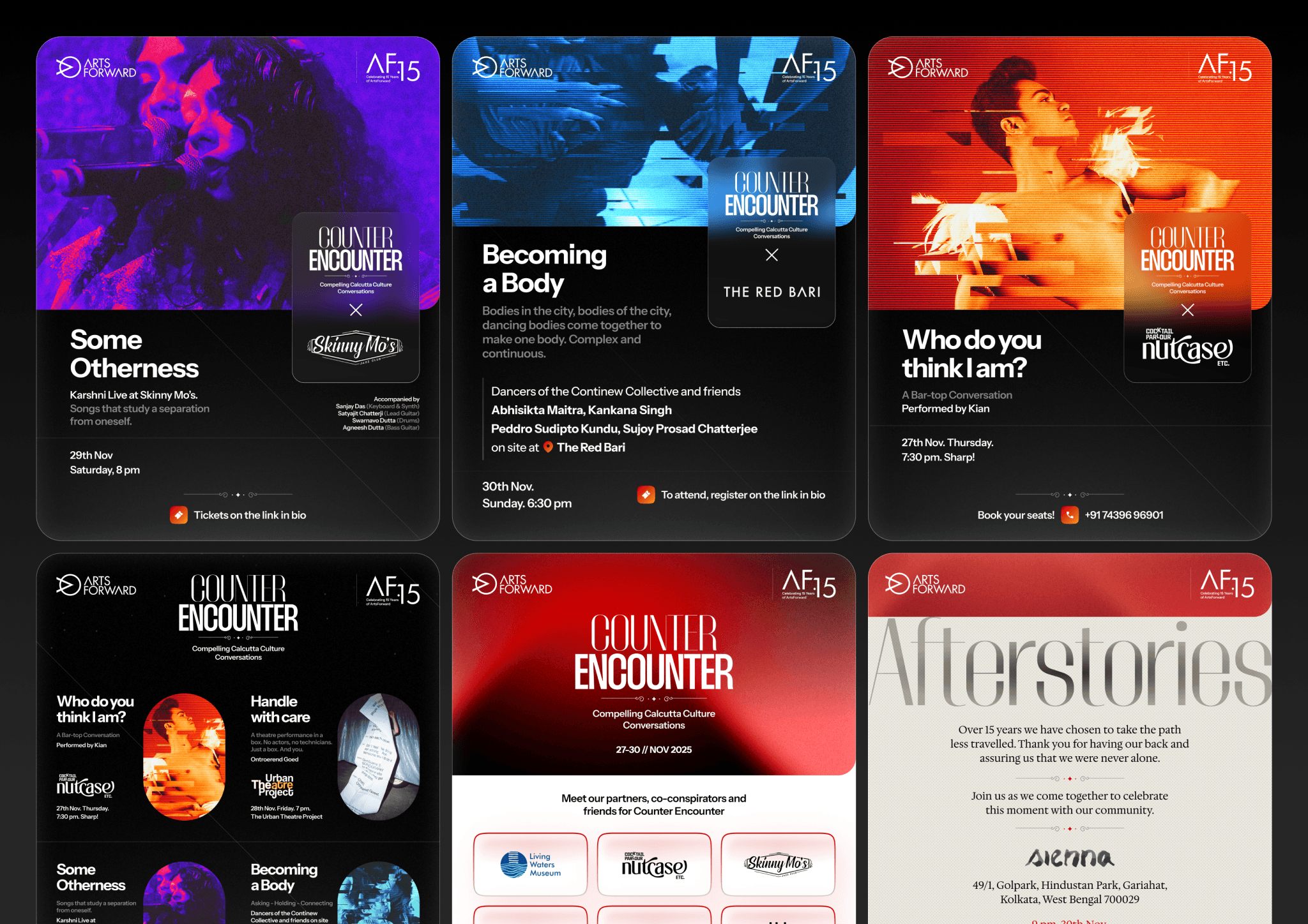 Artsforward wanted AF15 to be more than a milestone — it had to reflect the organisation’s mission of nurturing artists, building audiences for the arts, engaging youth, and promoting environmental/social consciousness through creative expression. The challenge: unify many strands — dance, theater, music, heritage, social art — under a flexible yet consistent identity that could work across multiple events and spaces, both physical and digital. The visual system needed to feel rooted in arts culture, yet accessible and contemporary enough to engage a broad, diverse community.